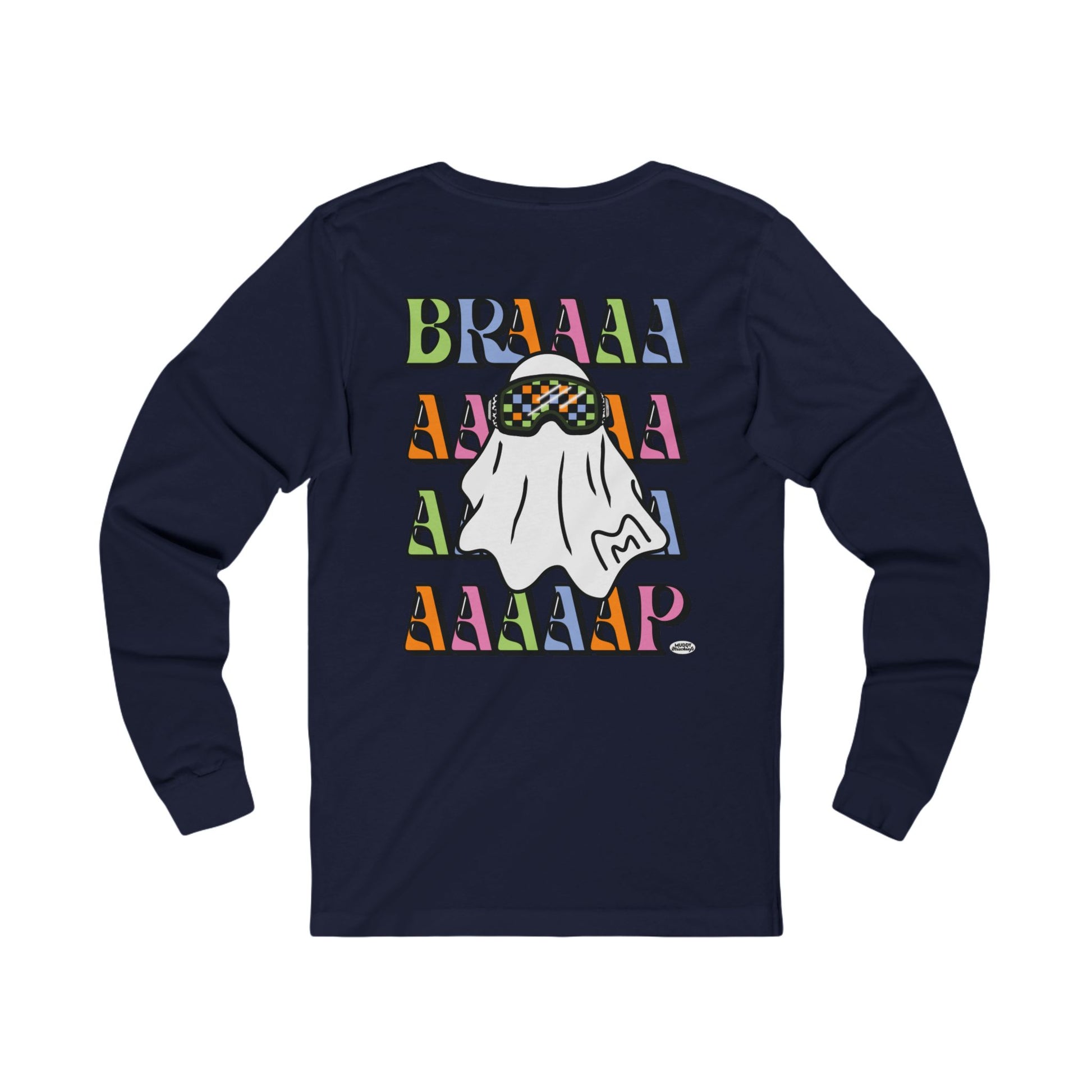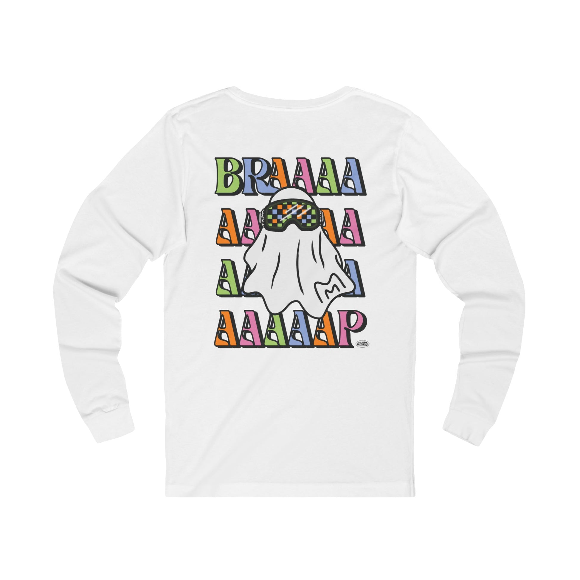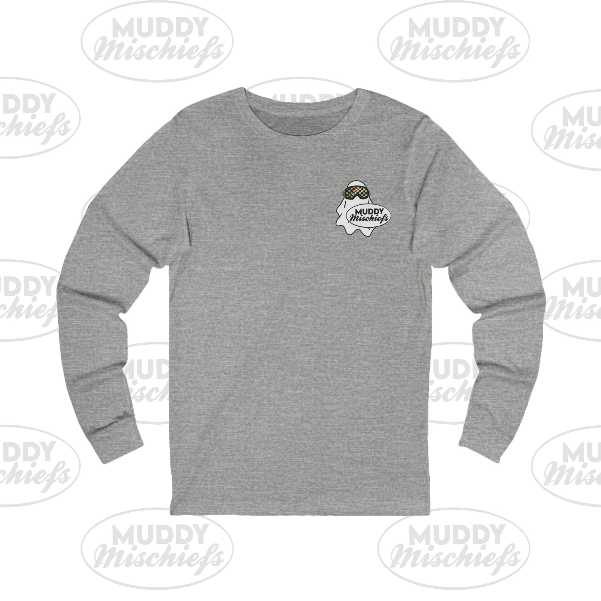 Printed on both front and back, the front features the goggle ghost alone with our Muddy Mischiefs emblem. On the back, you'll find your favorite goggle ghost again, with Booooo- err, we mean, BRAAAAAAAAP in the background. Printed on Bella + Canvas, designed with love by Muddy Mischiefs.