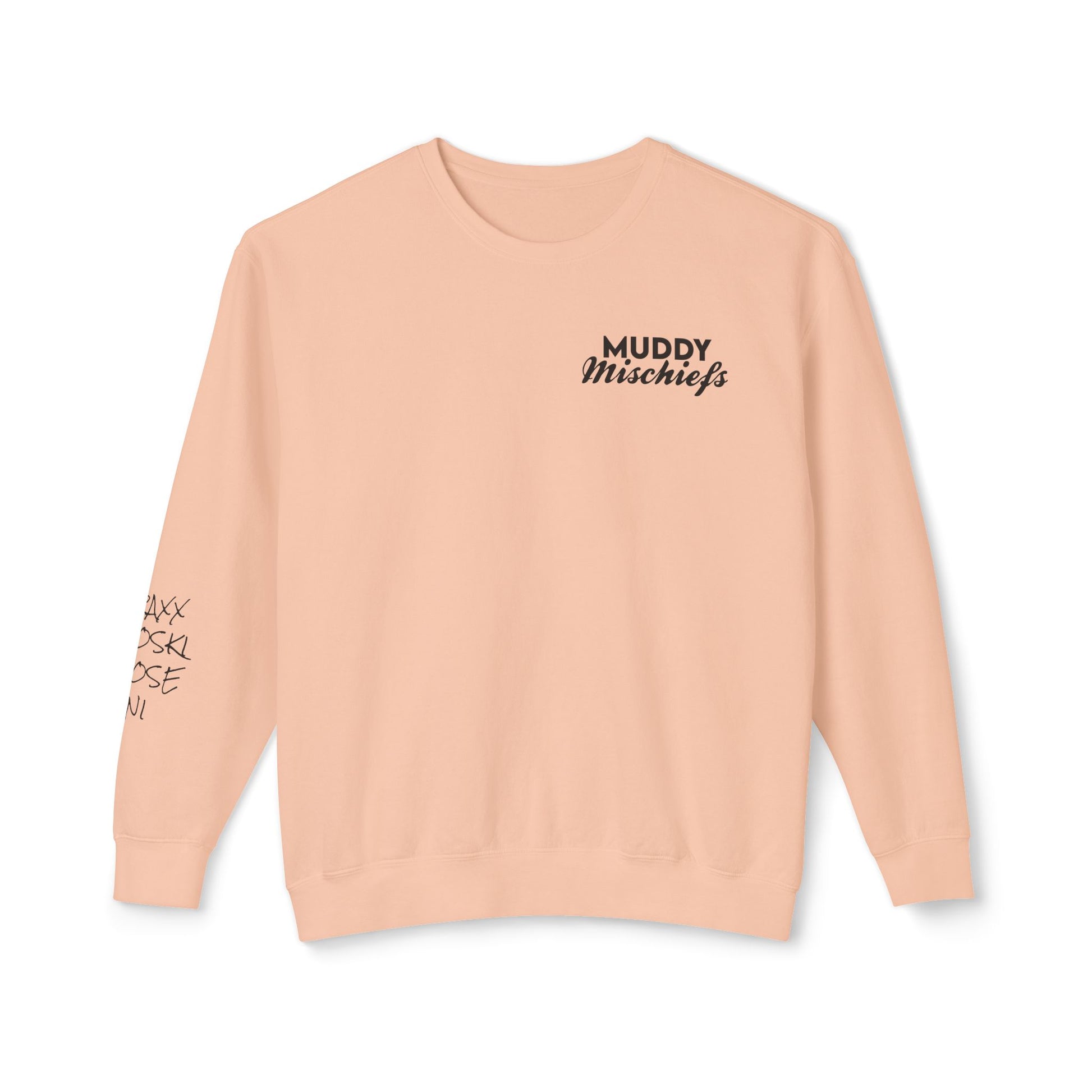 On the front of this crewneck sweatshirt, you'll find our brand name: Muddy Mischiefs. On the back, it says "Somebody's Muddy Mischief Mama," which has to be true if you're here. On the sleeve, you can PERSONALIZE your Muddy Mischief sweatshirt with your rider's name(s)! Please make sure to type the names correctly when you order yours! How you type it is how we're printing it 😉. STAY PROUD and WEAR YOUR MUDDY MISCHIEF'S NAME ON YOUR SLEEVE. This design is printed on a Comfort Colors crewneck sweatshirt-- soft, vintage feel with 100% ring-spun pre-shrunk cotton. Relaxed fit.