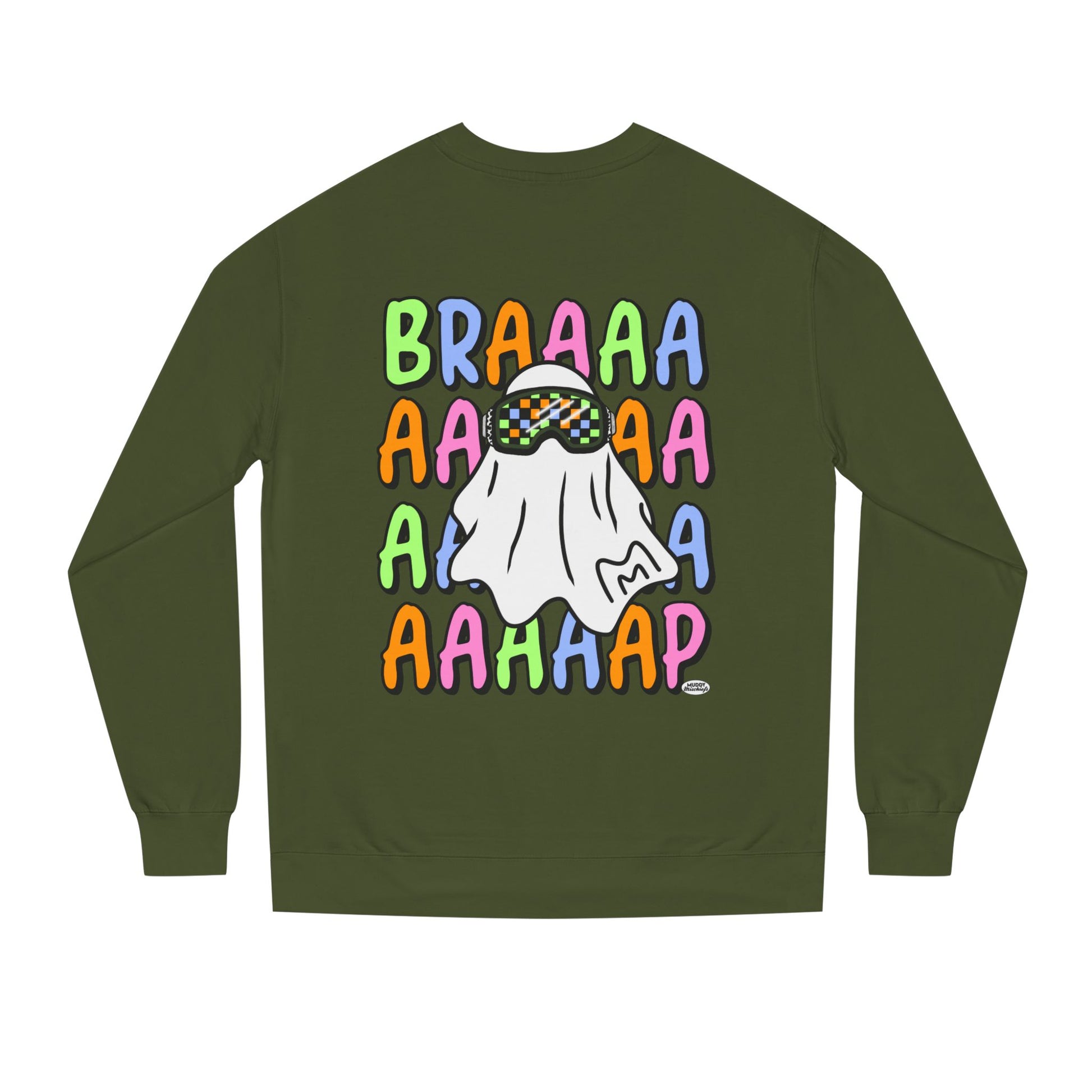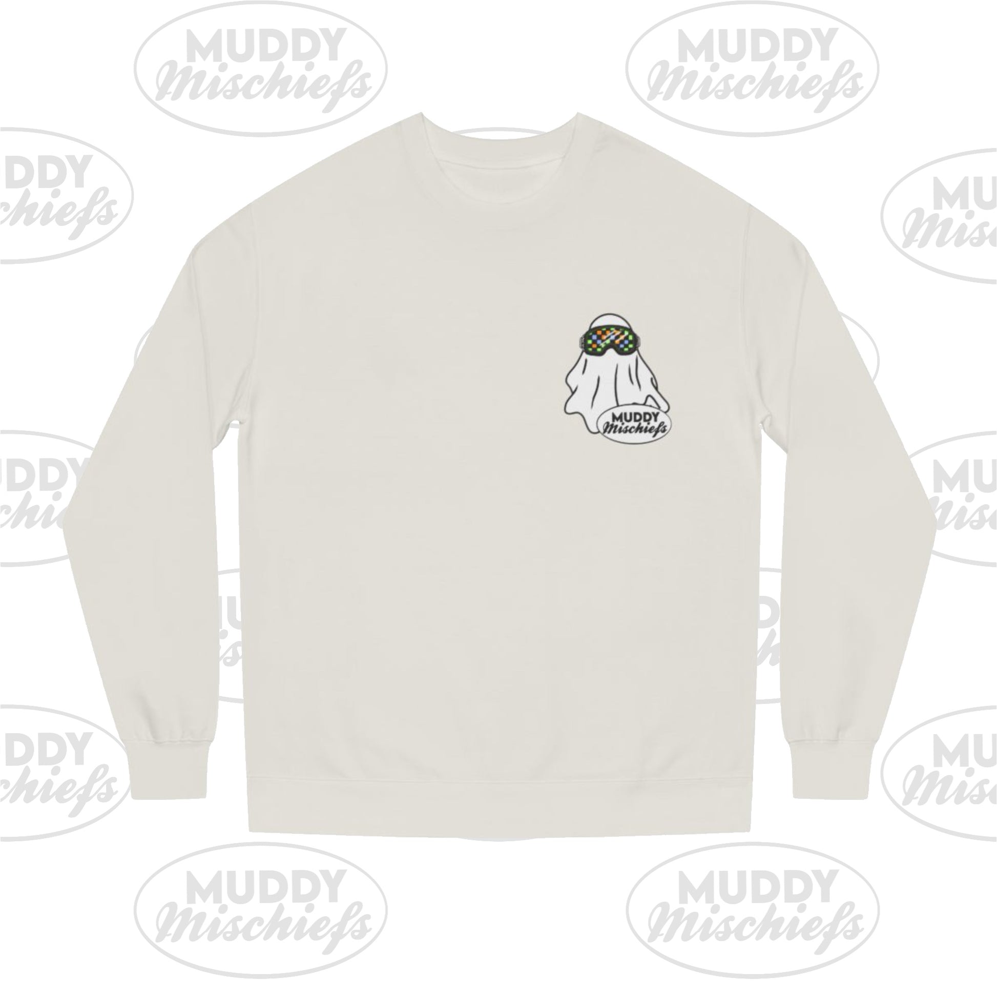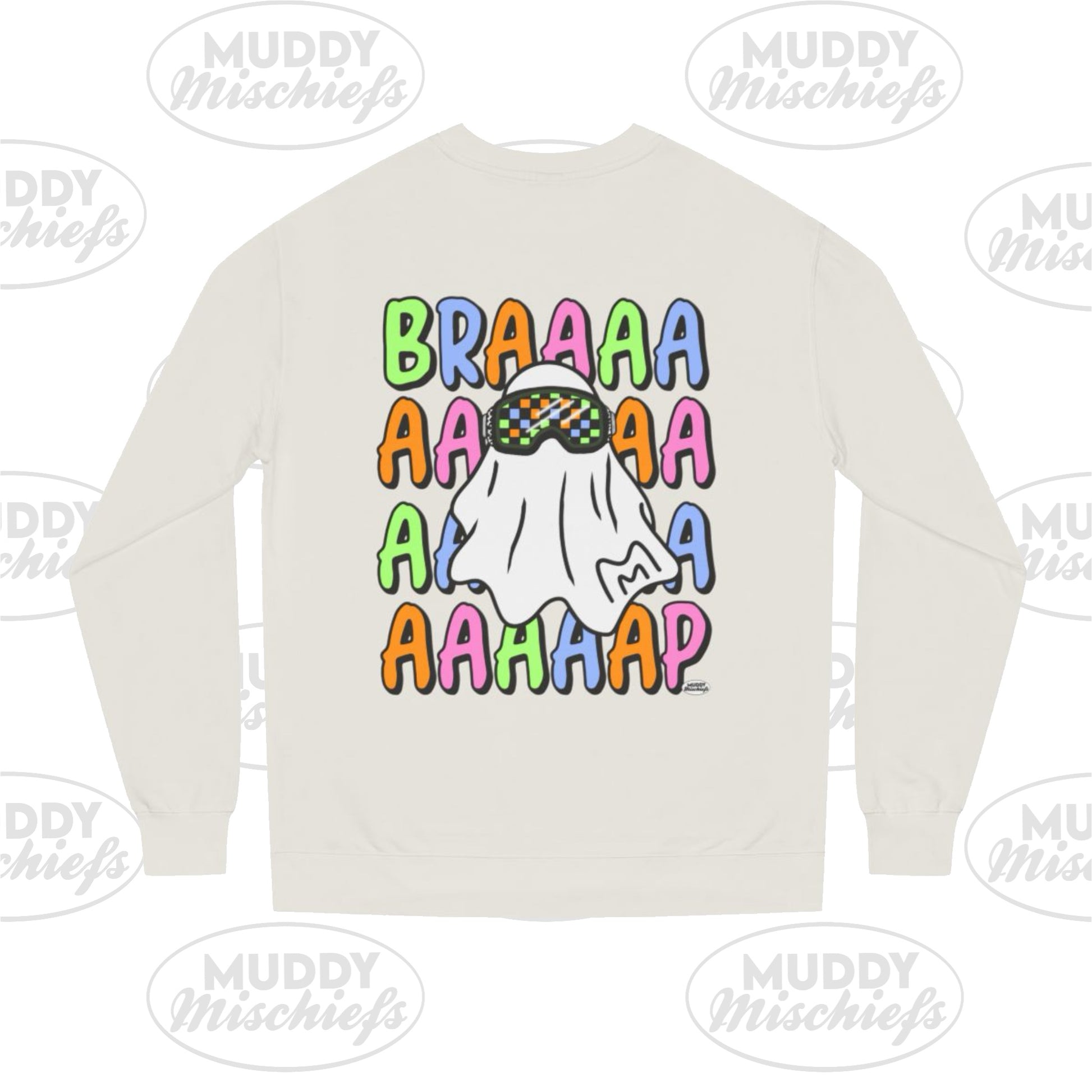 Printed on both front and back, the front features the goggle ghost alone with our Muddy Mischiefs emblem. On the back, you'll find your favorite goggle ghost again, with Booooo- err, we mean, BRAAAAAAAAP in the background. Printed on Independent Trading Company SS3000, designed with love by Muddy Mischiefs.