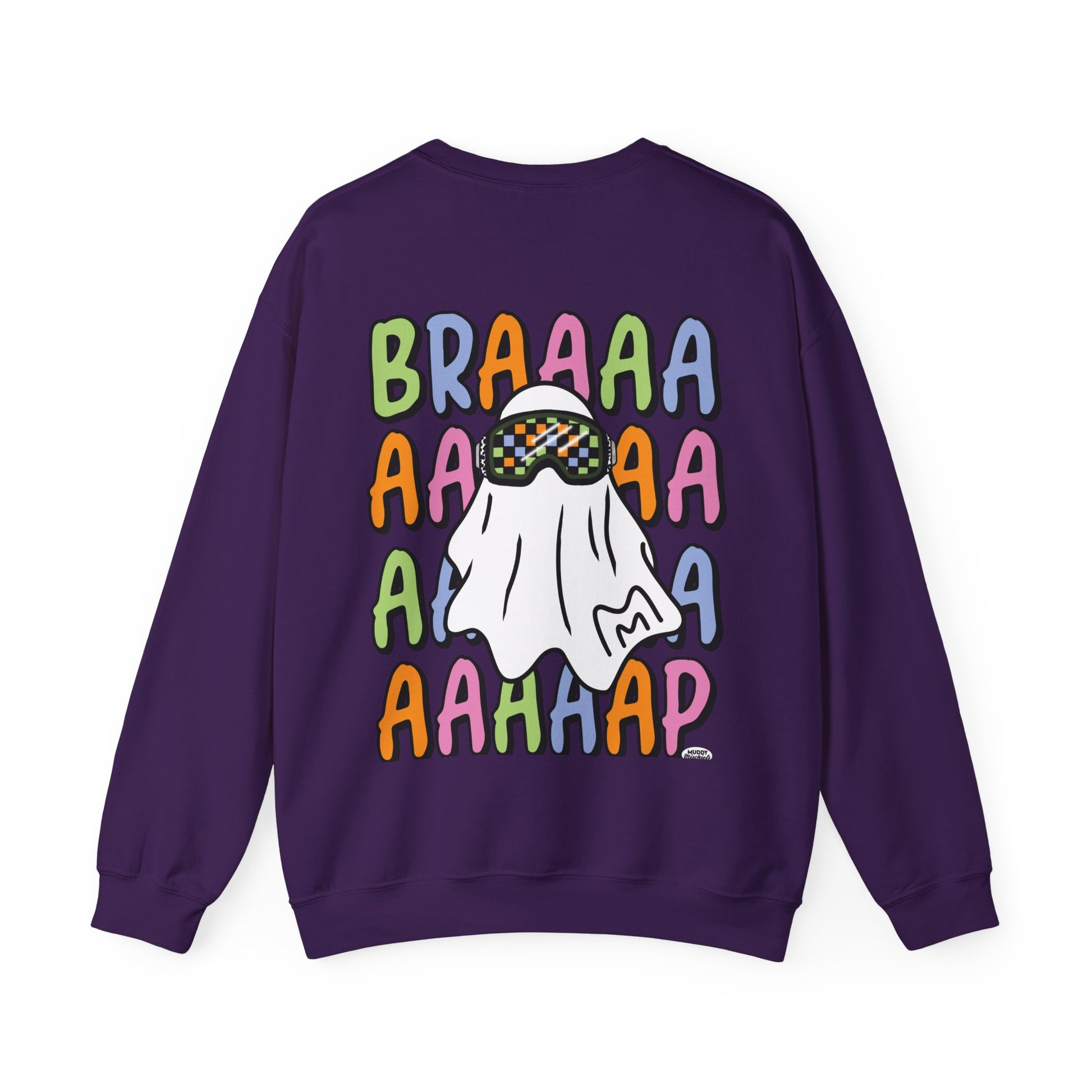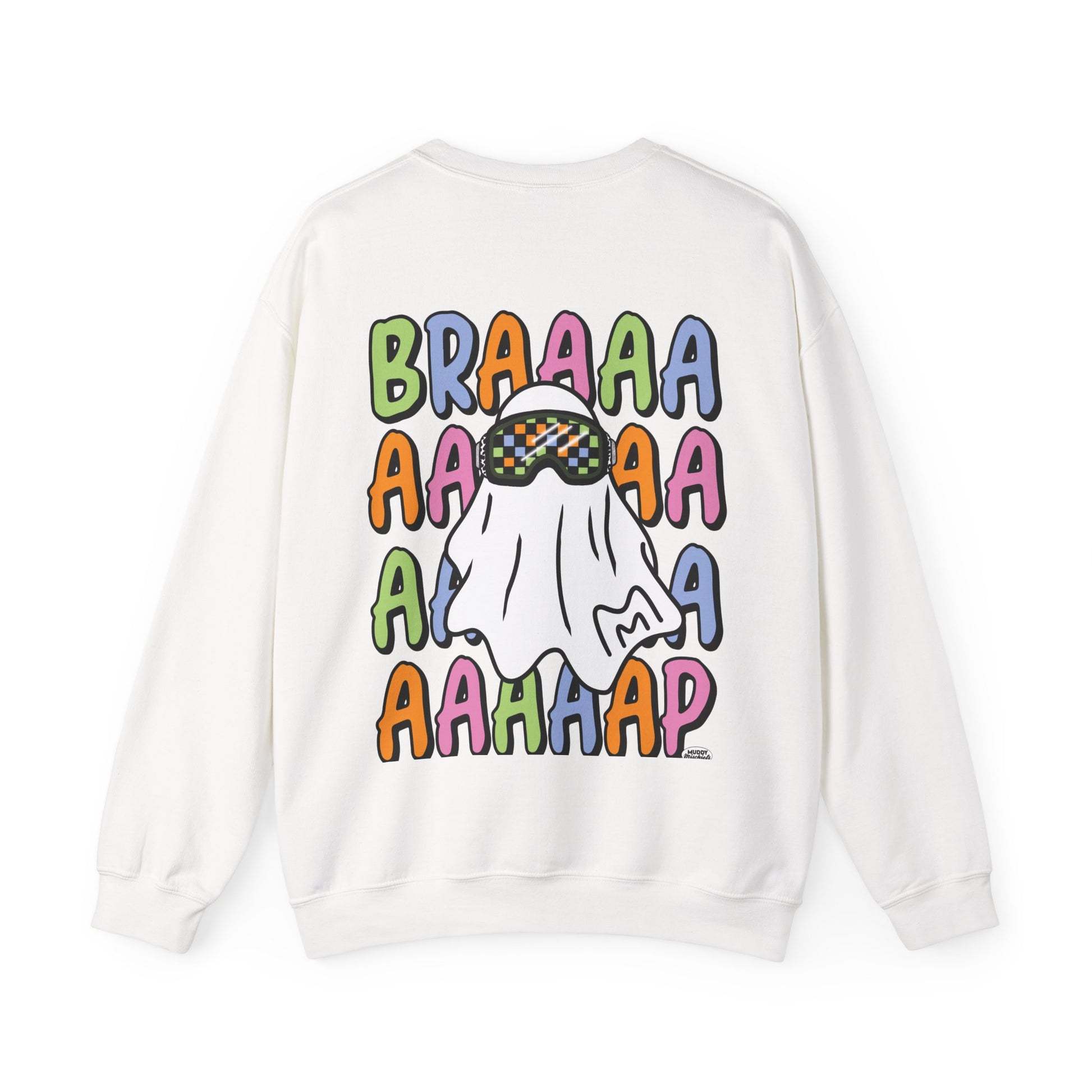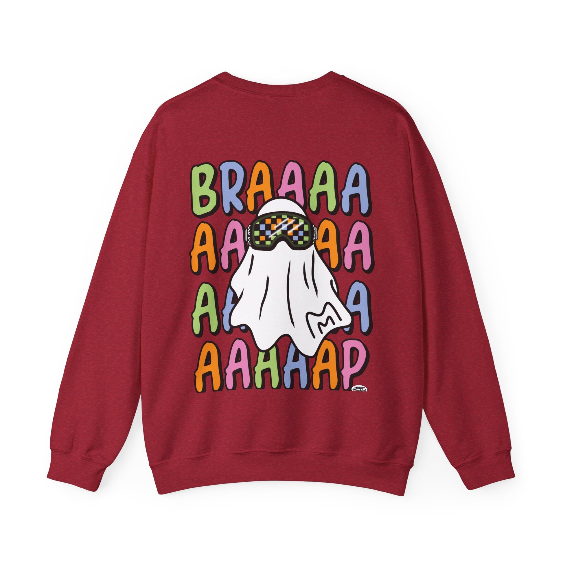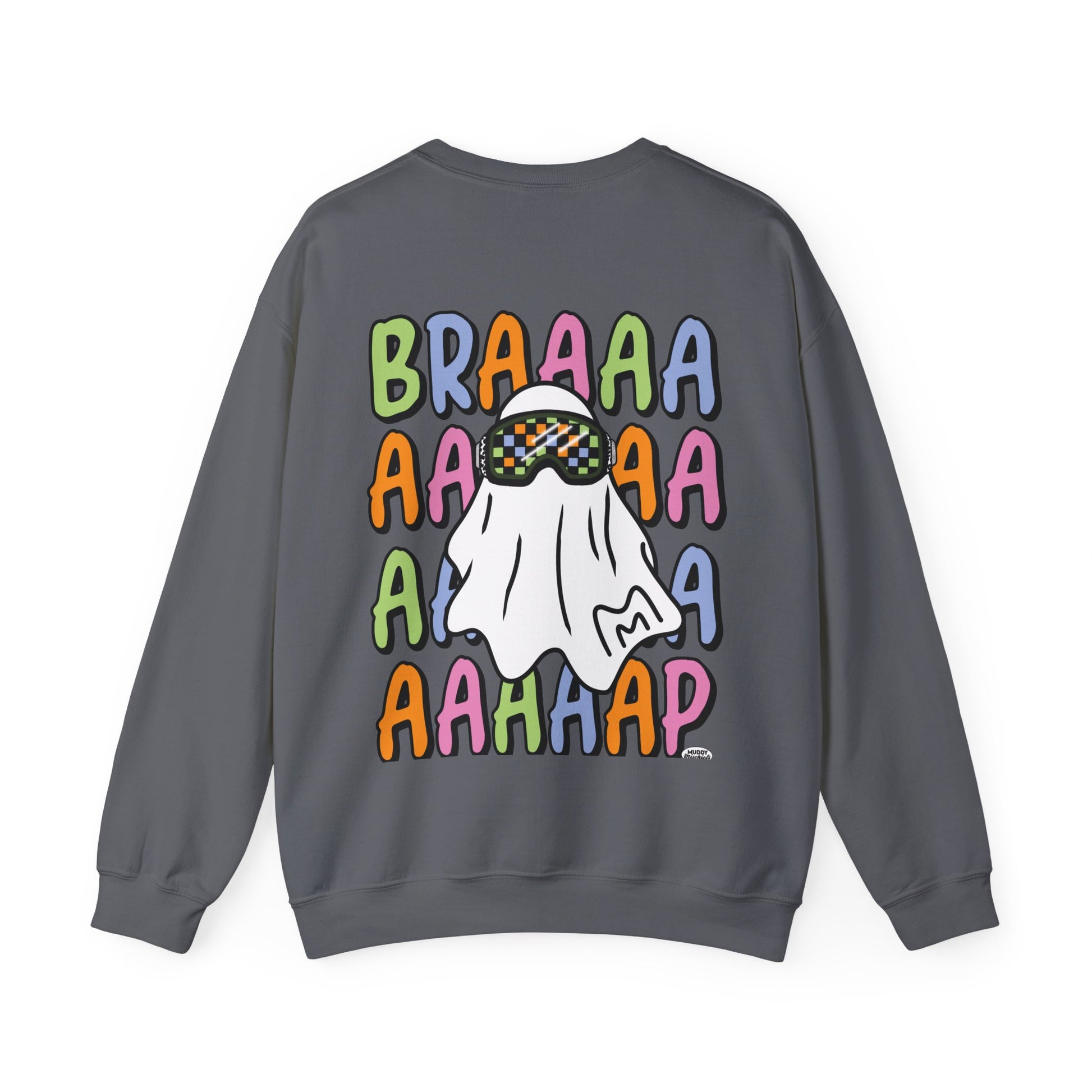 Printed on the front you'll find your favorite goggle ghost, with Booooo- err, we mean, BRAAAAAAAAP in the background. Printed on Gildan, designed with love by Muddy Mischiefs.