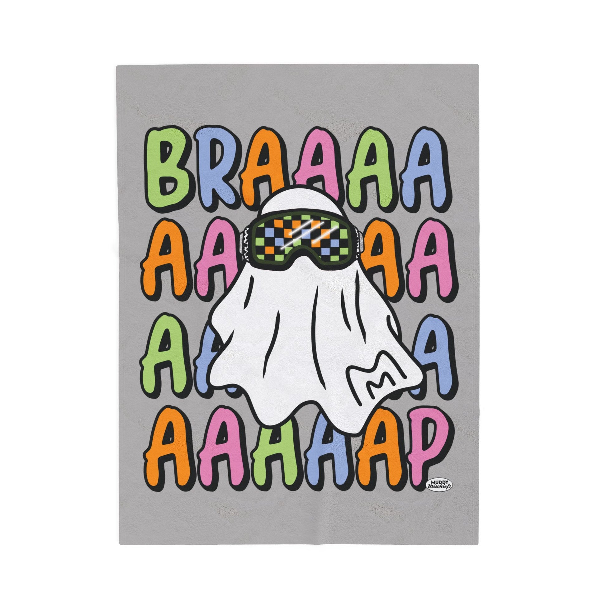 Printed on the front you'll find your favorite goggle ghost, with Booooo- err, we mean, BRAAAAAAAAP in the background. Designed with love by Muddy Mischiefs.