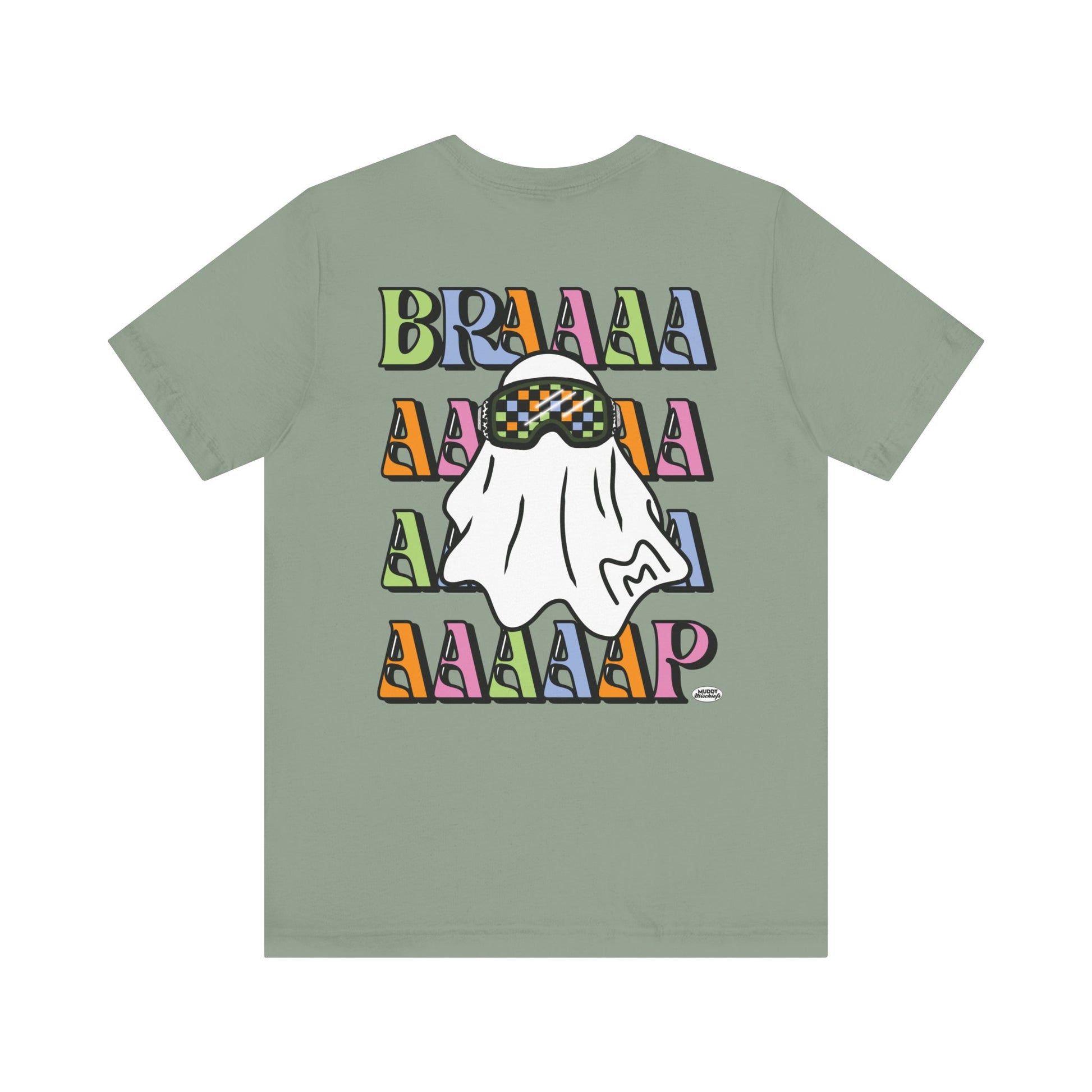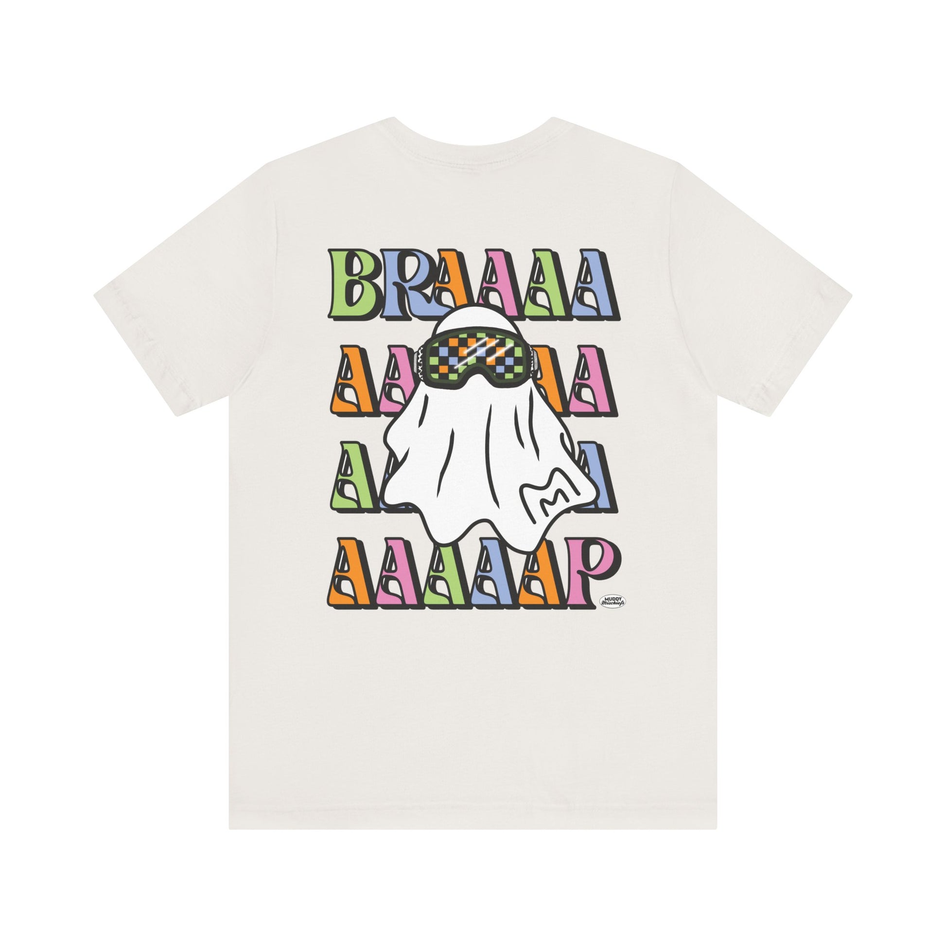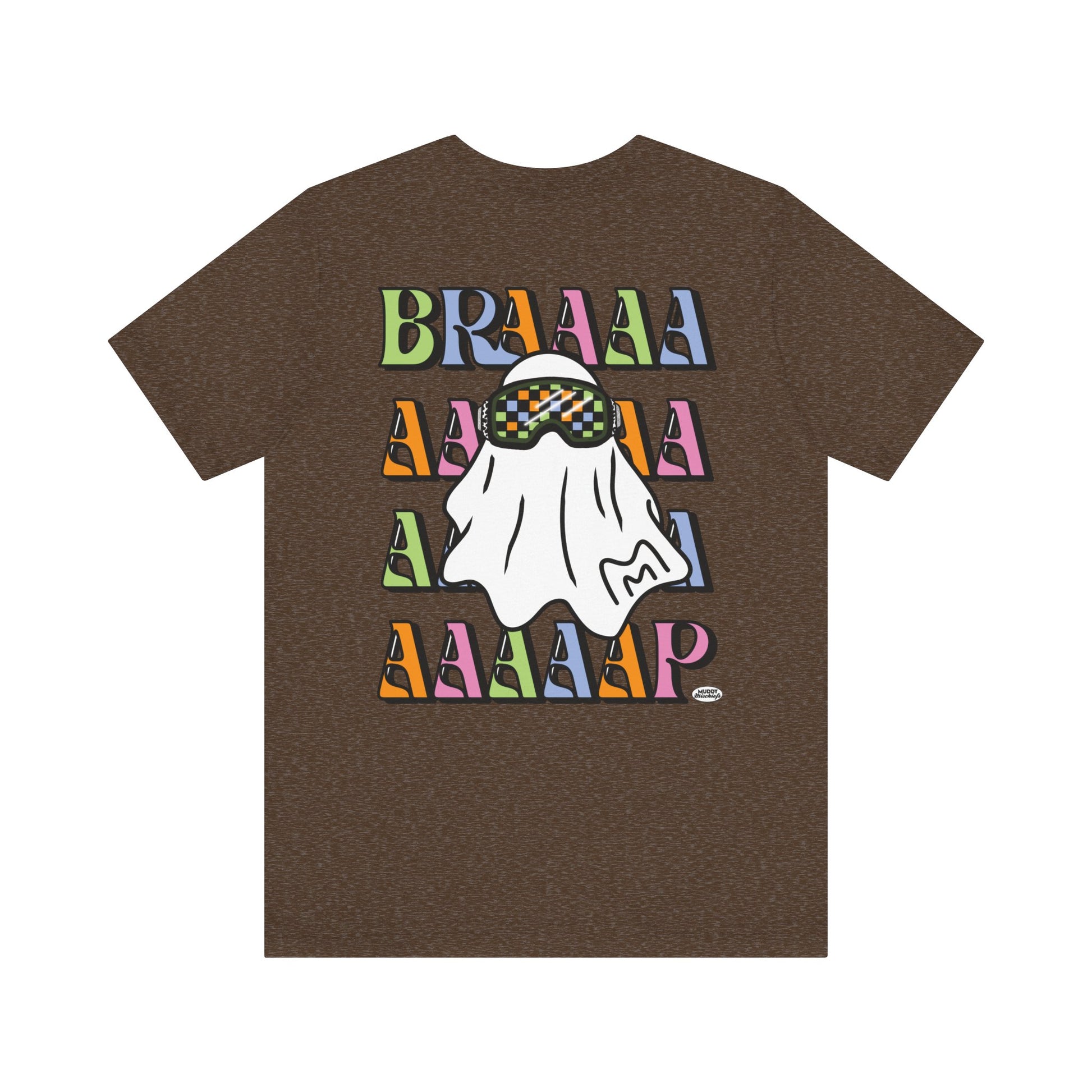 Printed on both front and back, the front features the goggle ghost alone with our Muddy Mischiefs emblem. On the back, you'll find your favorite goggle ghost again, with Booooo- err, we mean, BRAAAAAAAAP in the background. Printed on Bella + Canvas, designed with love by Muddy Mischiefs.
