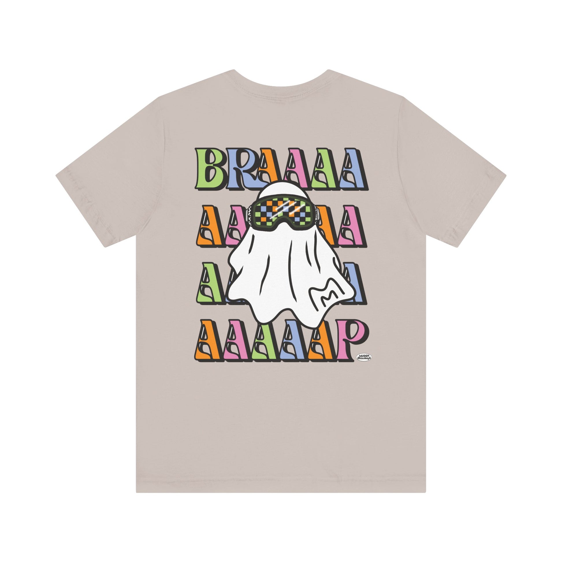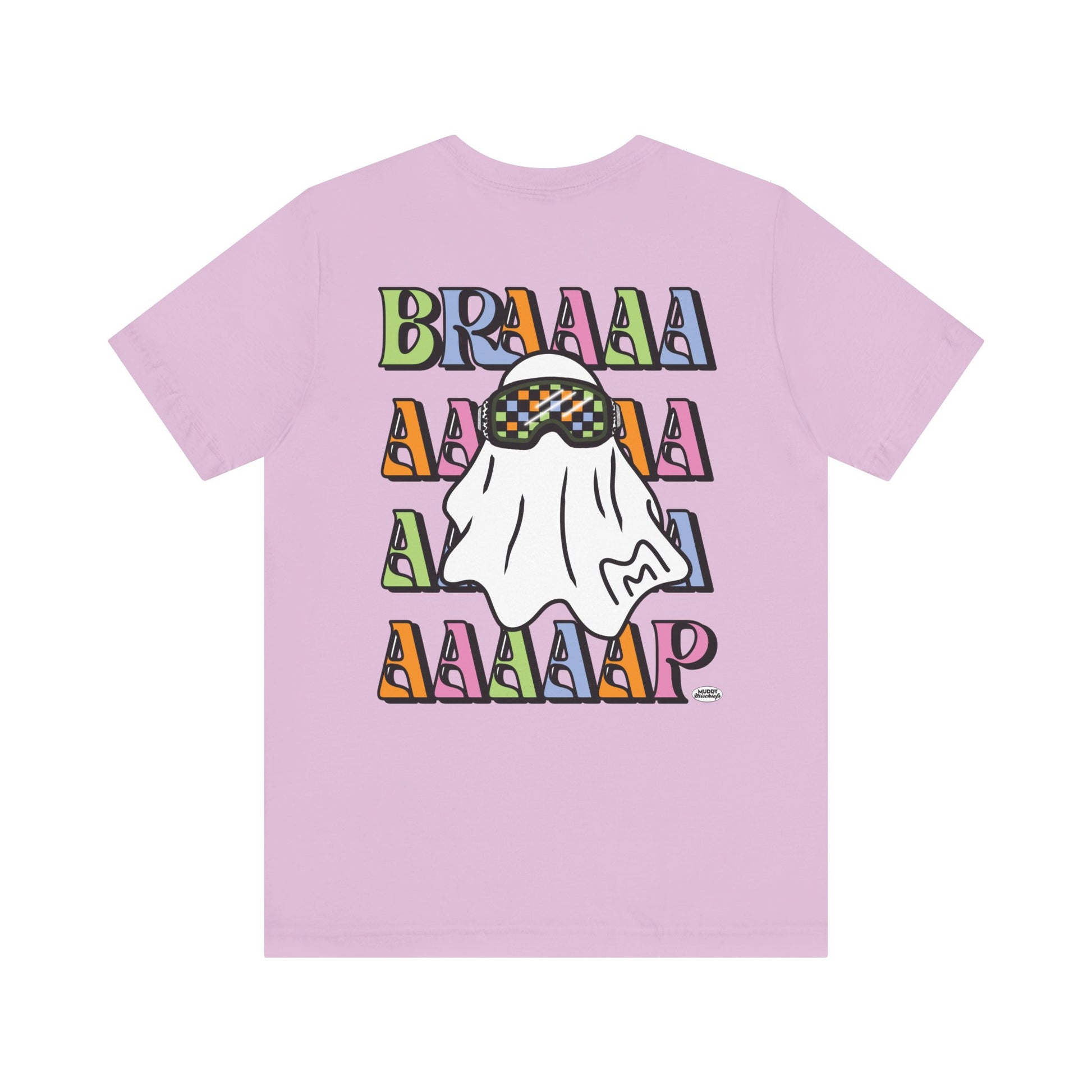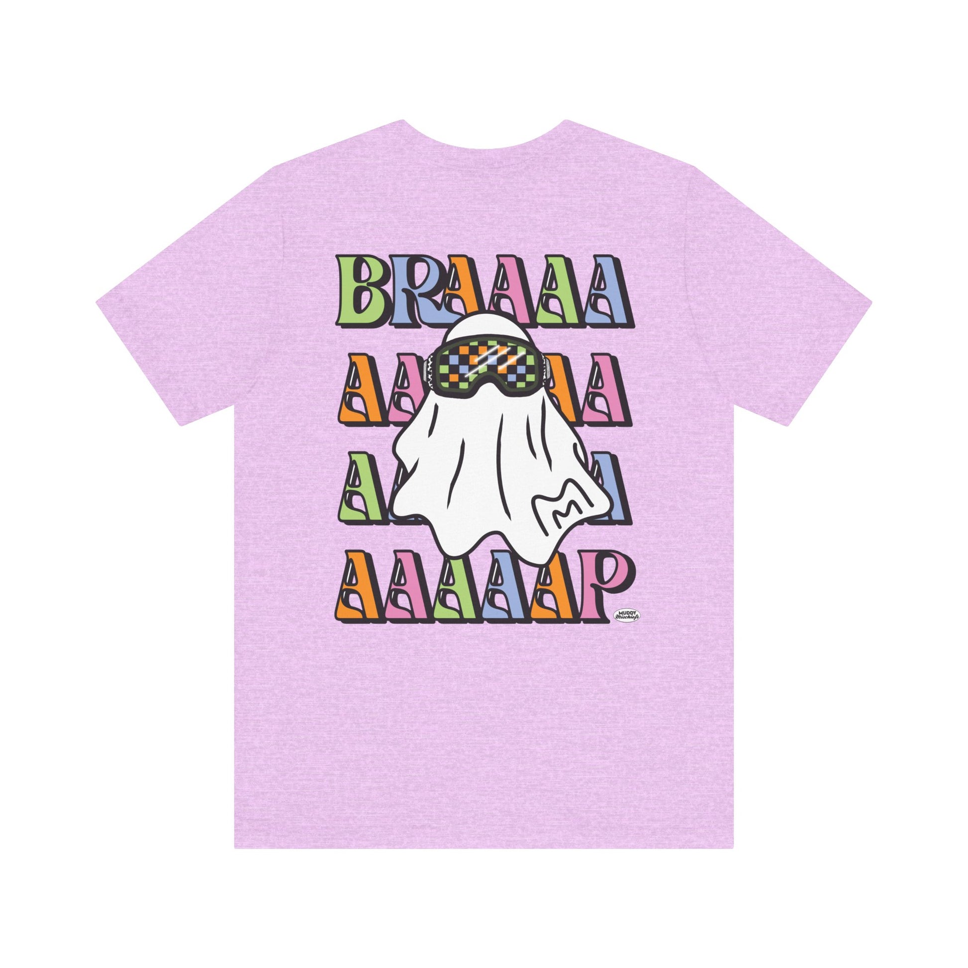 Printed on both front and back, the front features the goggle ghost alone with our Muddy Mischiefs emblem. On the back, you'll find your favorite goggle ghost again, with Booooo- err, we mean, BRAAAAAAAAP in the background. Printed on Bella + Canvas, designed with love by Muddy Mischiefs.
