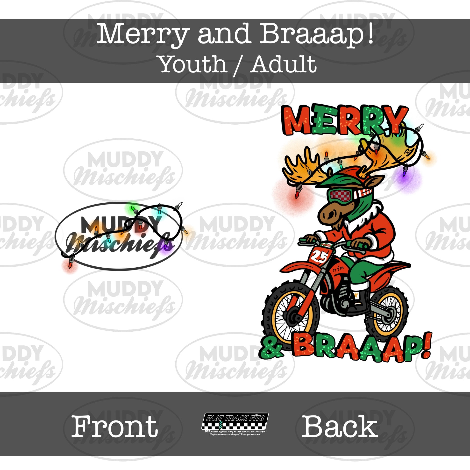 Have you ever seen a moose— riding a DIRTBIKE— under the lights, down by the traaaack. Light up your antlers and braaap merrily, riders! Printed on Bella + Canvas*, designed with love by Muddy Mischiefs.